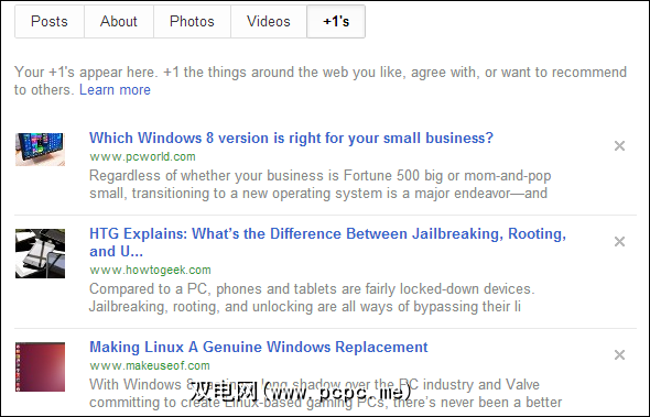 Google+允许您+1在网络上找到的内容。当您的圈子中的某人进行搜索时,Google会突出显示这些+1。点击个人资料页面上的+1标签,查看您的+1。您可以根据需要从此处删除自己+1的内容。