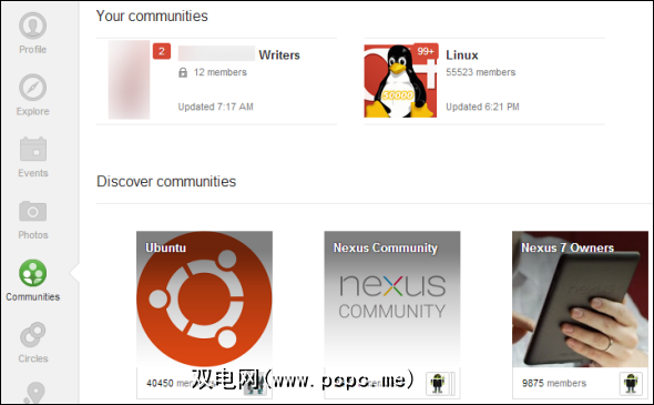 Google+允许您创建和加入社区。社区可以是只有几个人可以参加的小型私人团体,也可以是有共同兴趣的大型团体。您可以在“社区"标签上找到这些选项。