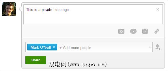 在创建帖子时,您可以选择与谁共享该帖子。您可以公开发布信息,也可以与一个或多个圈子分享。但是,您也可以通过仅与一个人共享信息来发送私人消息。只需确保在帖子底部的框中只提及该人的名字即可。