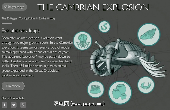 BBC Earth进行了25幅互动幻灯片演示,标志着地球历史上最大的事件。它从我们星球的诞生开始,直到人类诞生的20万年前。沿途对每个事件都进行了详细说明,并附有插图录像。