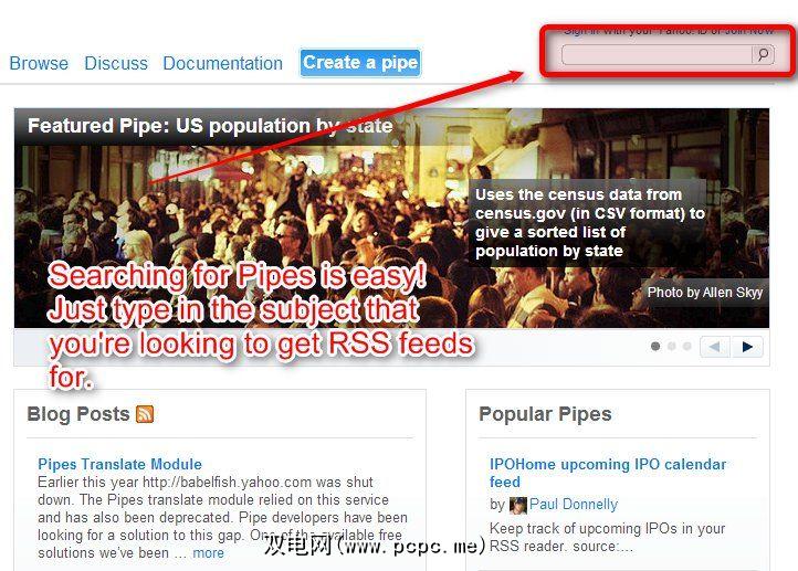 Yahoo允许其用户共享预组装的Pipes。它们的形式和功能各不相同。例如,一个管道使用户能够搜索特定邮政编码内的所有可用工作清单。另一个管道允许用户在寻找交易的网站上搜索特定物品。 Pipes数据库非常广泛,我强烈建议浏览该数据库以获取想法。