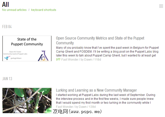 通常,您的阅读器客户端将包括一些接受RSS feed的方式。订阅后,随着新内容的发布,它将显示在阅读器内部。