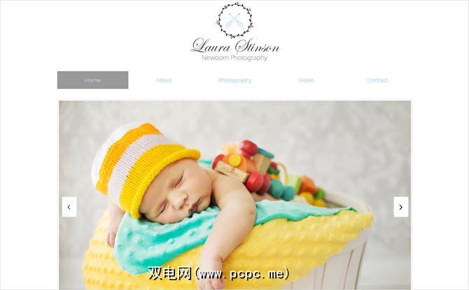 新生儿摄影外观清脆雅致。您的照片在主页上旋转,其余的工作还有一个“摄影"部分。您可以通过完成“关于",“视频"和“联系方式"部分来分享更多信息。