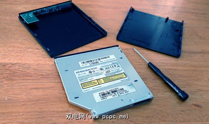 要准备将驱动器插入外壳,请先从光驱上拆下抽拉盖。检查弹出的光盘抽屉的底侧,然后拧下螺钉。如果驱动器具有弹出装置,也可以卸下它。