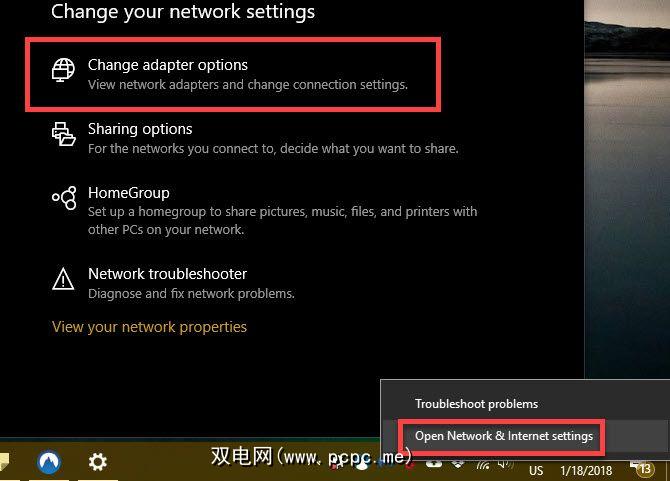 在Windows 10上,右键单击系统任务栏中的网络图标,然后选择打开网络和Internet设置。单击更改适配器选项条目,然后双击您正在使用的连接。