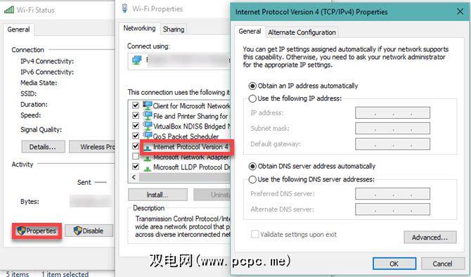 从此处,单击属性按钮。在列表中找到 Internet协议版本4 ,然后双击它。在这里,请确保同时选择自动获取IP地址和自动获取DNS服务器地址。手动设置IP地址适用于高级用户。