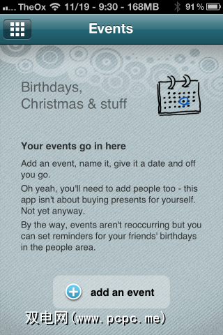 第一部分称为活动。在这里,您将能够添加生日,假期以及任何其他需要您为他人购买礼物的活动。创建新事件时,您可以将其设为小组事件或个人事件,具体取决于事件适用的人数。对于圣诞节和复活节等受欢迎的假期,它们将显示在列表中,因此您可以单击它们并自动添加日期。为了充分利用此部分,您需要继续进入人员部分。