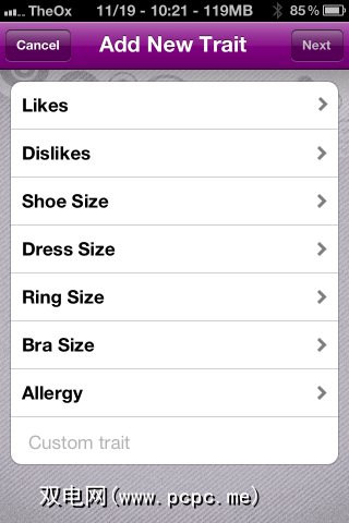 “人物"部分的最后一件事是个性特征。在这里,您可以跟踪一般的喜好以及关键信息,例如鞋子的大小,戒指的大小以及在实际去商店购物时可以简化购物的事情。