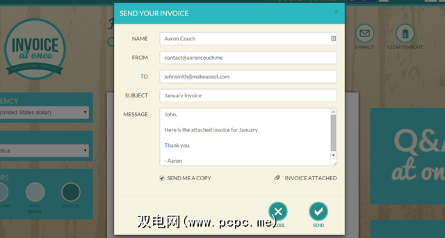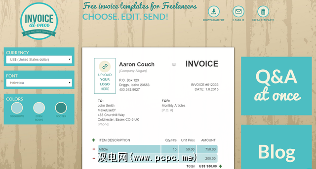 如果您想使用徽标,自定义字体和颜色,您一次需要发票。另外,请放心,如果您不小心关闭了标签页,那么当您回来时,同一张发票会等着您。专用的“清除模板"按钮可清除所有内容,包括您公司的信息(不幸的是)。您可以在同一页面上更改币种,上载徽标甚至通过电子邮件发送发票。