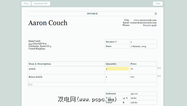 可结算是精简的发票创建网站,其缺少的功能几乎是本身。如果本文中的某些网站具有创意的设计和许多功能,Billable可以保持简洁,简洁的界面,而不缺少任何必要的功能,例如用于复制和粘贴的大型文本框以及专用的``打印'',``下载''和``保存''按钮。是的,即使这个功能稀疏的网站也可以将最新发票保存在浏览器的缓存中。您和您客户的信息的文本框也很容易粘贴到其中,而无需重复制表和键入每一行。
