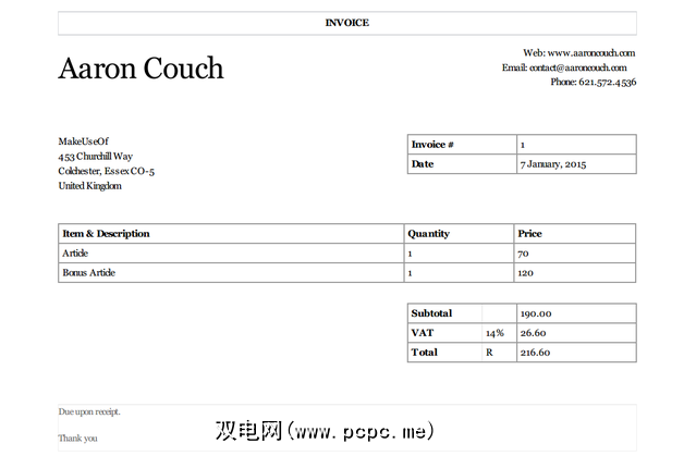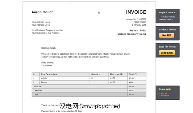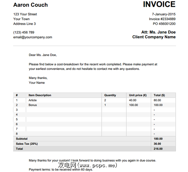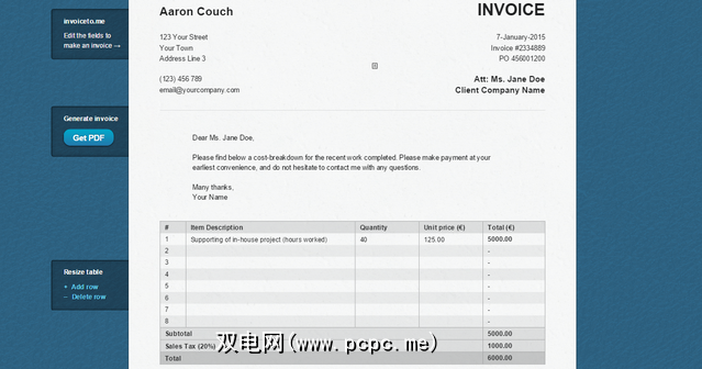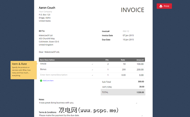 Invoiceto.me是另一个基本的发票创建者,具有很少但有用的功能。它会自动保存到浏览器的本地存储中,因此,如果您在创建发票的过程中关闭标签或浏览器,则不会丢失所有内容。发票条目上方的“从客户到客户"文本框是您可以向客户写快速便笺的地方。发票条目下方的文本框可用于付款条件和任何其他注释。