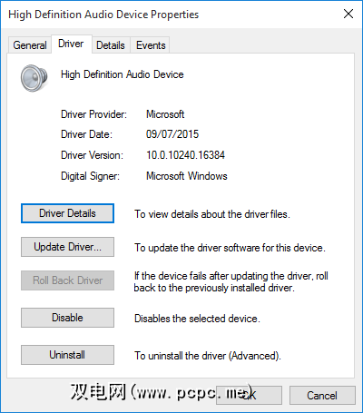 Windows 10为我们提供了一些抗击令人讨厌的驱动程序的选择。首先,我们可以尝试将其回滚到最后一个好的配置。右键单击开始按钮,选择设备管理器,然后右键单击您的声音驱动程序,选择属性,并浏览到 Driver 标签。如果可用,请按 Roll Back Driver (回滚驱动程序)选项,Windows 10将开始执行该过程。