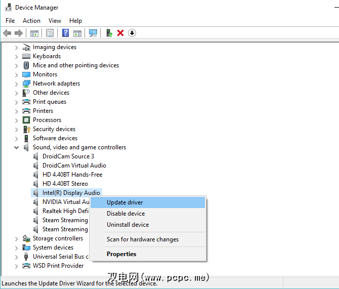 通过设备管理器访问硬件。右键单击开始并选择设备管理器,即可找到此内容。展开声音,视频和游戏控制器,然后识别您的音频设备。除非您具有专用的音频硬件,否则通常为 Intel(R)Display Audio 。