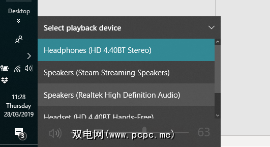 因此,如果您使用蓝牙耳机,请记住在不使用设备时将其关闭或与计算机断开连接。另外,请花一点时间单击系统托盘中的扬声器图标,然后选择其他音频输出。