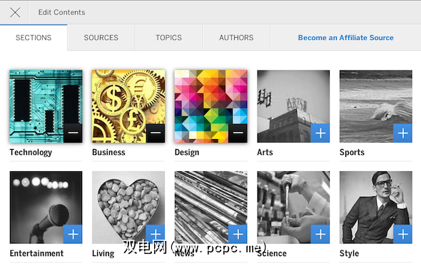注册免费帐户后,您首先要做的就是编辑来源。关于如何选择将出现在个性化杂志上的内容类型,有多种选择。您可以一次添加整个部分-按类别划分。可用的类别包括技术,商业,艺术,设计等等。如果没有您感兴趣的主题,您还可以创建自己的自定义部分。