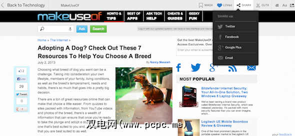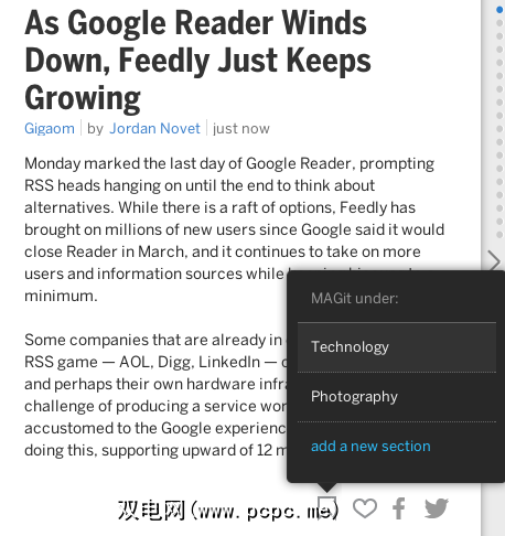 除了在Twitter,Facebook等上共享单个内容外,您还可以发布自己的内容您的关注者可以在其杂志上转到一页,查看您发现有趣的所有文章(按类别划分)。您可以通过两种方式将内容添加到杂志上,这两种方式都是手动的。与Paper.li之类的服务相比,此功能完全是手动的,使您可以完全管理出现的所有内容。您还可以添加封面图像,并为杂志指定一个有趣的标题。
