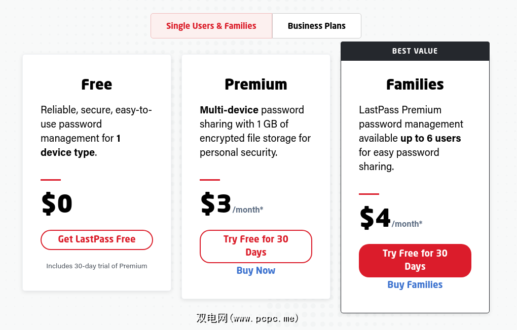 LastPass 高级计划的起价为每月 3 美元,家庭计划可扩展至每月 4 美元,涵盖六个许可证,商业团队每位用户每月 6 美元。商业计划提供了几个令人兴奋的功能,如应用程序集成、可定制的安全策略、管理仪表板、深入报告等。