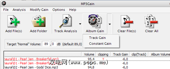 添加了所有要标准化的文件后,单击分析按钮。从那里,您可以在下拉菜单中选择曲目或专辑分析。 MP3Gain现在会分析每个文件以检查当前音量以及该文件是否存在剪切问题。跟踪增益指示与目标音量匹配所需的音量增加或减少。您可以通过从“分析"按钮下拉菜单中选择“清除分析"来清除结果。
