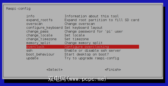 这实际上是升级设备固件。完成后,重新启动Pi并运行Raspi-config。此程序将使您能够设置各种选项,其中之一是启用超频。