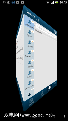 与您期望的差不多,没有太多令人震惊的事情。您可以通过滑动来切换标签,但是Go Contacts EX借此机会展示了一些视觉效果,而不是通过标准的Android滑动行为来实现:
