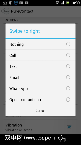 Swiping each of these contacts right would email them, in my case. Swiping left would send a WhatsApp message. You can also configure up- and down-swipes to perform various actions.