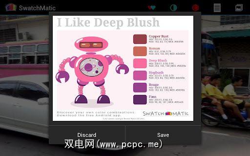 在Android上安装SwatchMatic [不再可用],然后使用相机检测和重用颜色。该应用程序检测相机所指向的颜色,并创建一个与之匹配的调色板。结果选择保存为图像,包括颜色名称和代码。