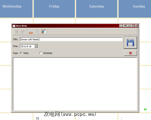 双击日期和新笔记屏幕将自动弹出。在这里,您可以输入注释的标题和可选摘要。您可以将其存储为 Note 或 Schedule 。如果您决定使用时间表备忘,除了能够设置您希望的时间长度外,没有什么其他的。老实说,这是一项不完整的功能。