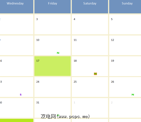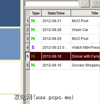 创建便笺后,日历视图上的日期表明便笺或计划项目存在 N 或 S 符号。对于Notee来说,在此视图中显示每个注释的标题或摘要会更好,但是方便地在右侧有您所有注释的视图。
