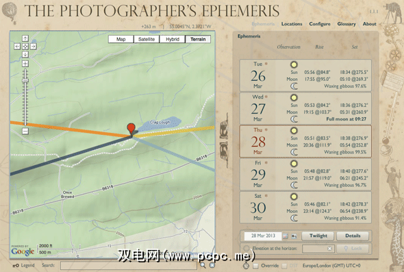 摄影是关于光的。如果您在自然光下进行大量摄影,那么知道何时何地进行拍摄可以节省旅行的成本。有些应用程序可以帮助您消除猜测,而更好的工具之一是围绕Google Maps构建的。摄影师的星历表是一个光线估算器,它可以告诉您如何在计划拍摄的区域投射光线(日光或月光)。户外摄影是真正的动作所在,TPE计算器可以帮助您在精确的有利位置和准确的时间将相机俯仰以获取正确的视角。