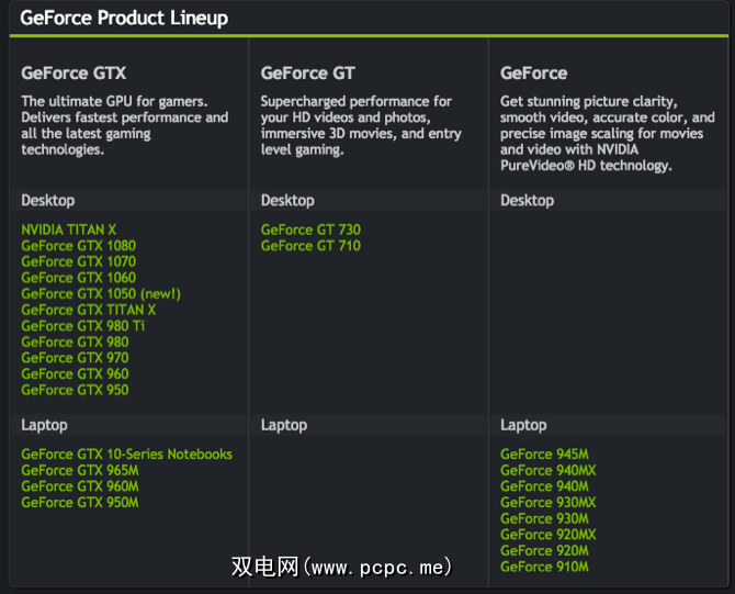 Nvidia提供的大多数GeForce卡都在GTX系列中,但是也有GT卡,有些卡的型号之前没有前缀: