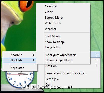 Docklet基本上就是Dock中的微型应用程序。 ObjectDock附带了多个功能,包括天气,时间,电池寿命,“开始"菜单等。还有其他第三方可以在网上下载。可以通过右键单击扩展坞(如下所示)或通过“设置"窗口来添加这些,方法是转到在我的扩展坞上,然后单击“ 添加新的扩展坞"。