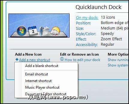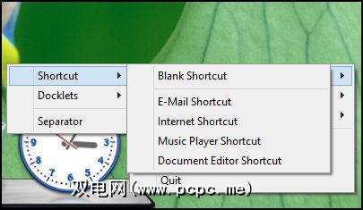 您可以在扩展坞上拥有三个主要功能:快捷方式,扩展坞和分隔符。快捷方式可以是通过ObjectDock选择的特定快捷方式,例如文档编辑器或媒体播放器,也可以从桌面或文件夹手动将任何应用程序快捷方式拖到快捷方式上,这可能是最快的方法。要获得特定的快捷方式,您可以通过右键单击并添加到快捷方式添加快捷方式。