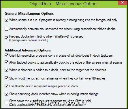 在“设置"窗口的“设置"选项卡下,有一些更多自定义选项。您可以切换ObjectDock启动,隐藏Windows任务栏,如果您是Plus用户,请在正在运行的任务上启用Aero Peek。底部有一个标题为 Advanced Tweaks 的按钮,其中包含其他几个值得关注的其他选项。