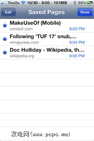 要访问保存的页面,只需单击屏幕底部中间的按钮。您将看到所有已保存页面的列表。如果要删除页面,则可以在页面上滑动以显示删除按钮,也可以单击“ 编辑"按钮并将不同页面标记为要删除。