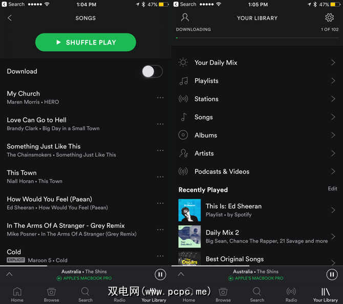 如果您是Spotify Premium订阅者,则可以在iPhone或Android手机上下载歌曲以供离线使用。 Spotify可让您在最多三台设备上下载多达3,333首歌曲。只要每30天连接一次互联网,您就可以连续离线访问这些歌曲。