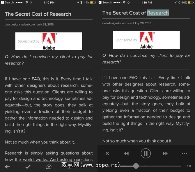 安装Pocket的应用程序及其在桌面浏览器中的扩展程序,然后开始保存文章。它们将被下载到Pocket应用中,您无需互联网即可阅读它们。不想读书吗?使用Pocket的内置文本语音转换功能可以朗读它。
