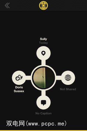 拍照时,它们将被保存在Oggl库中,该库仅对您可见。当您从图库中打开照片并点击时,它将显示镜头和胶片组合,照片的拍摄位置和日期,是否共享以及是否有标题。