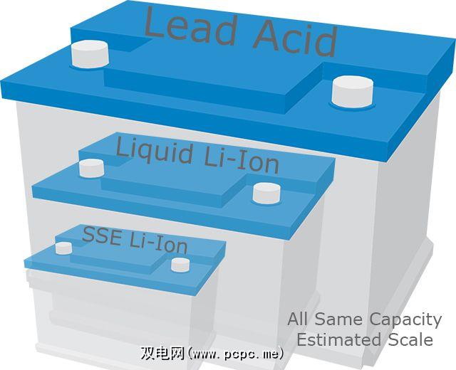 考虑到锂离子电池在三分之二的空间中可以容纳与铅酸电池一样多的能量,您可以看到SSE电池可以有多小。它将是类似容量的铅酸电池的三分之一。