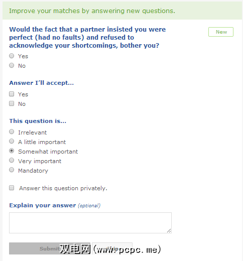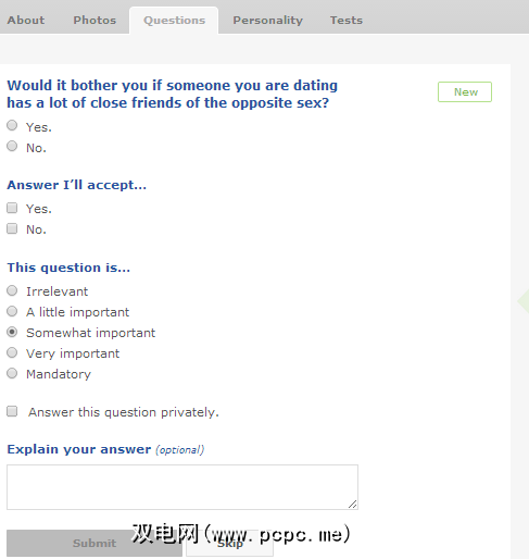 OKCupid通过两种关键方式使自己与竞争脱颖而出。首先,网站的氛围(通过可爱的用户界面和简洁的幽默感注入)比大多数竞争对手都友好且低调。其次,OkCupid大多避开个性测试,而倾向于用户生成的问题和机器学习,从而产生更合理的问题-不是“你是灵魂伴侣吗?"而是“你会相处吗?"。