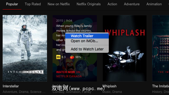 将鼠标悬停在任何海报上,您将会看到IMDb的电影或电视节目的简短摘要以及评分。没错,Smartflix使用IMDb信息,而不使用Netflix自己的数据。您还可以右键单击任何标题,然后找到直接直接转到其IMDb页面或观看预告片的链接。
