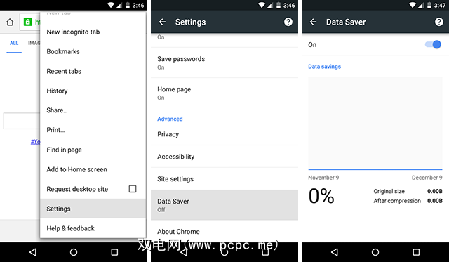 如何启用它:在Chrome应用中,下拉三点菜单并选择设置 。向下导航至数据保护器选项,然后将其打开。将来返回此选项页面,以查看新模式为您节省了多少数据。