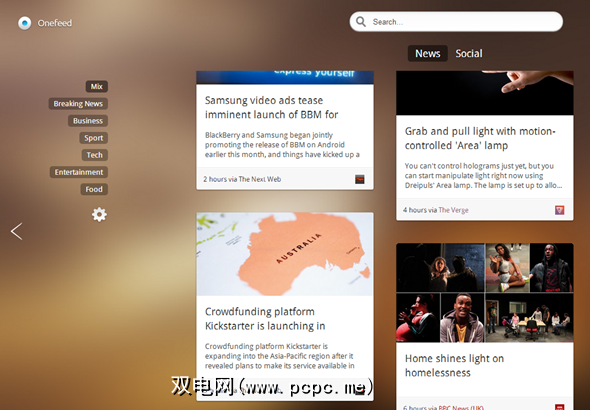 在新闻阅读器正面,您会找到上述的RSS阅读器和所连接网络的社交阅读器。 RSS阅读器已经装有一些提要,并且您可以随意添加和删除提要,但OneFeed附带了一些我从未删除过的提要。