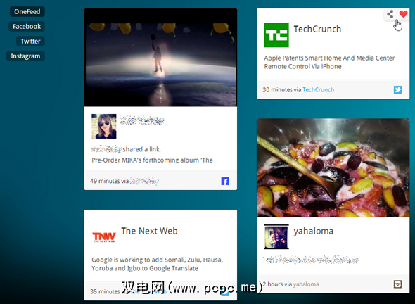 社交阅读器显示您所有来自所有连接网络的社交信息。您也可以通过从左侧边栏中选择一个来浏览单个网络提要。每个帖子上的小图标都会向您显示该帖子来自哪个网络,您可以直接在此页面上喜欢或收藏帖子,或将其分享到Facebook,Twitter或Gmail。您无法通过OneFeed添加评论,但是您可以单击图块以访问原始帖子。
