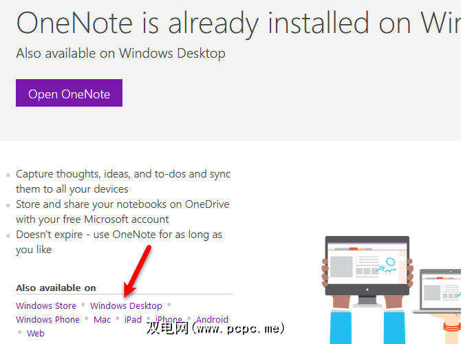OneNote随Office 365订阅一起作为OneNote 2016桌面应用程序附带。虽然Office 365订阅不是免费的,但OneNote 2016是免费下载的。单击OneNote下载页面上的 Windows桌面链接。