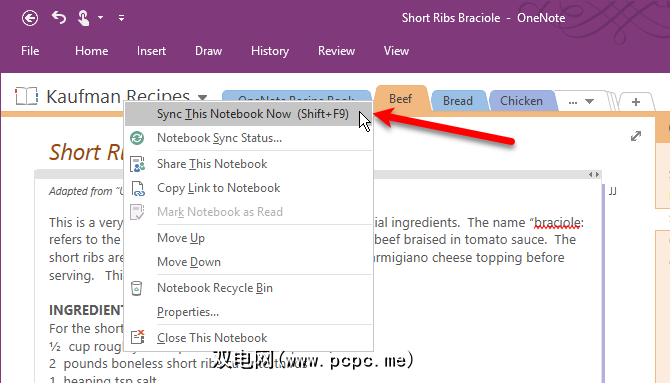 还可以在OneNote 2016桌面应用程序中手动同步笔记本。打开要同步的笔记本,然后使用以下方法之一手动开始同步该笔记本。
