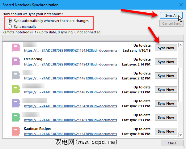 单击打开的笔记本旁边的立即同步以手动同步该笔记本,或单击全部同步以同步所有打开的笔记本。