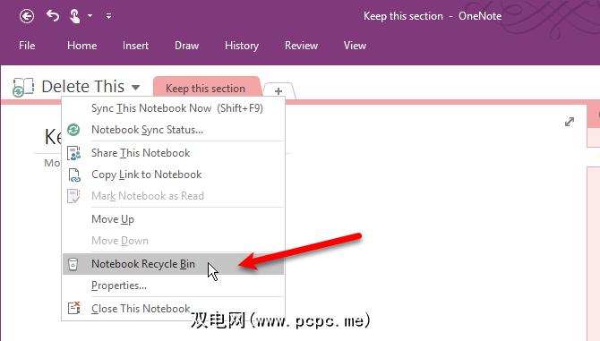 已删除的页面存储在笔记本计算机回收站中的已删除页面部分。要访问已删除的部分或页面,请打开有问题的笔记本,右键单击其名称,然后选择笔记本回收站。