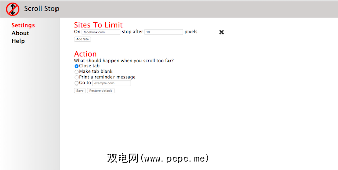 滚动停止可让您通过建立滚动限制来应对那些无休止的提要。耗尽该限制后,滚动停止即可执行这四个操作中的任何一个。它可以只是终止标签,将标签变成空白页,将您重定向到另一个网站,或打印提醒消息以恢复工作。