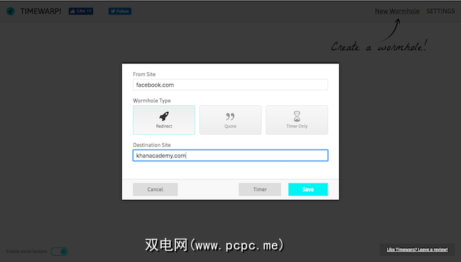 Timewarp lets you set what it calls Wormholes. You can configure one for every non-productive website and choose between three punishments whenever you visit it. You could either ask Timewarp to redirect it to another, perhaps an educational website, show a motivating quote, or simply block it.