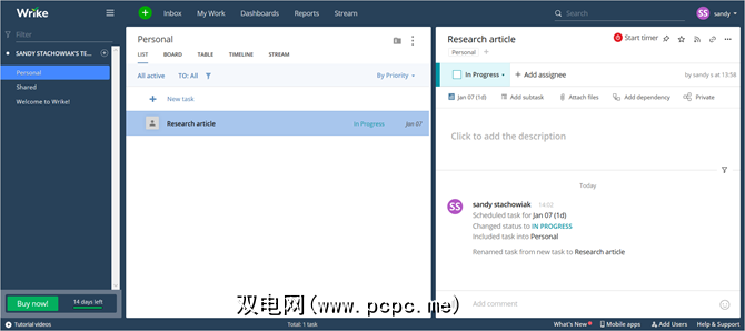 与Podio类似,另一个不错的在线工具是Wrike 。 Wrike的有趣之处在于,您可以以基于文本或视觉的方式查看项目,以最适合您的方式查看。从“列表",“板"或“表"视图中进行选择,或根据要查看的内容使用所有这三个视图。 Wrike还提供了一个项目和任务的时间轴视图,看起来像一个甘特图。